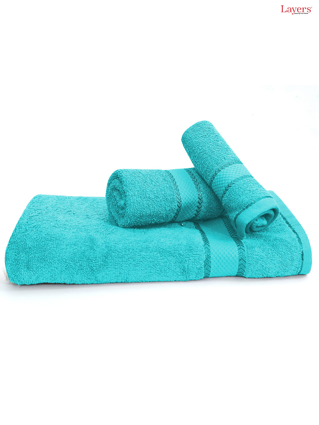 Layers Everfresh 100% Cotton 380 GSM Solid Towel Combo — Pack of 3 (1 Bath, 1 Hand, 1 Face). Extra-soft, ultra-fluffy and highly absorbent towels crafted from premium long-staple cotton for fast drying and lasting durability. 380 GSM provides a plush hotel-like feel without heavy drying time.