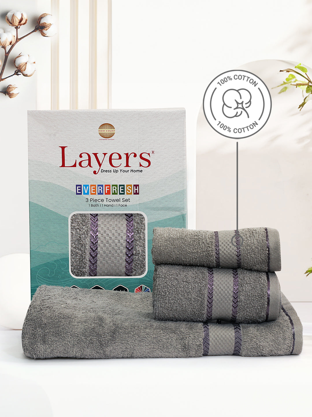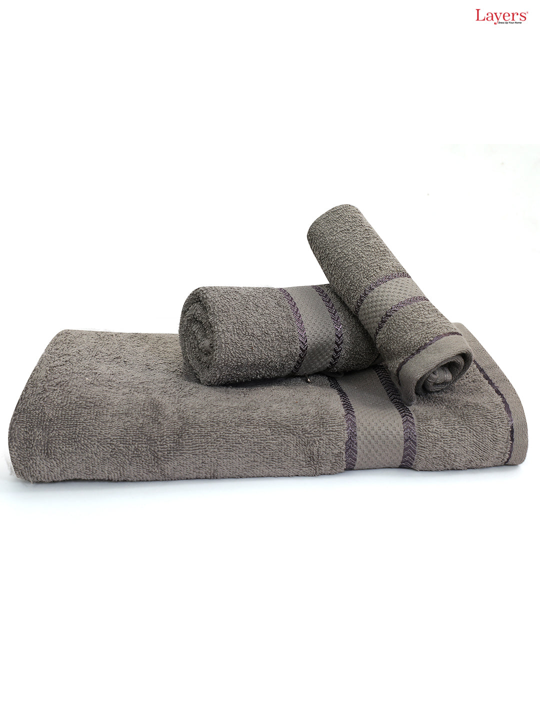 100% Cotton Towel Combo, 380 GSM Grey, Everfresh (1 Bath Towel, 1 Hand Towel & 1 Face Towel)