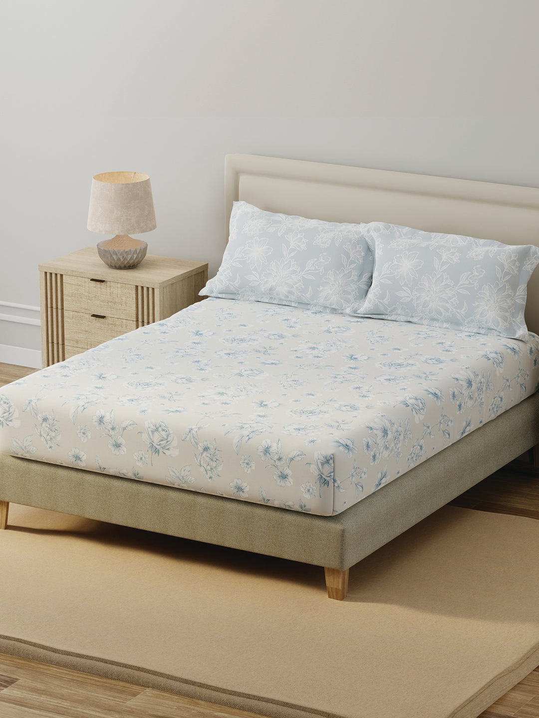 BasicX 100% Cotton 120 TC Blue & Grey Floral Double Bedsheet with 2 Pillow Covers