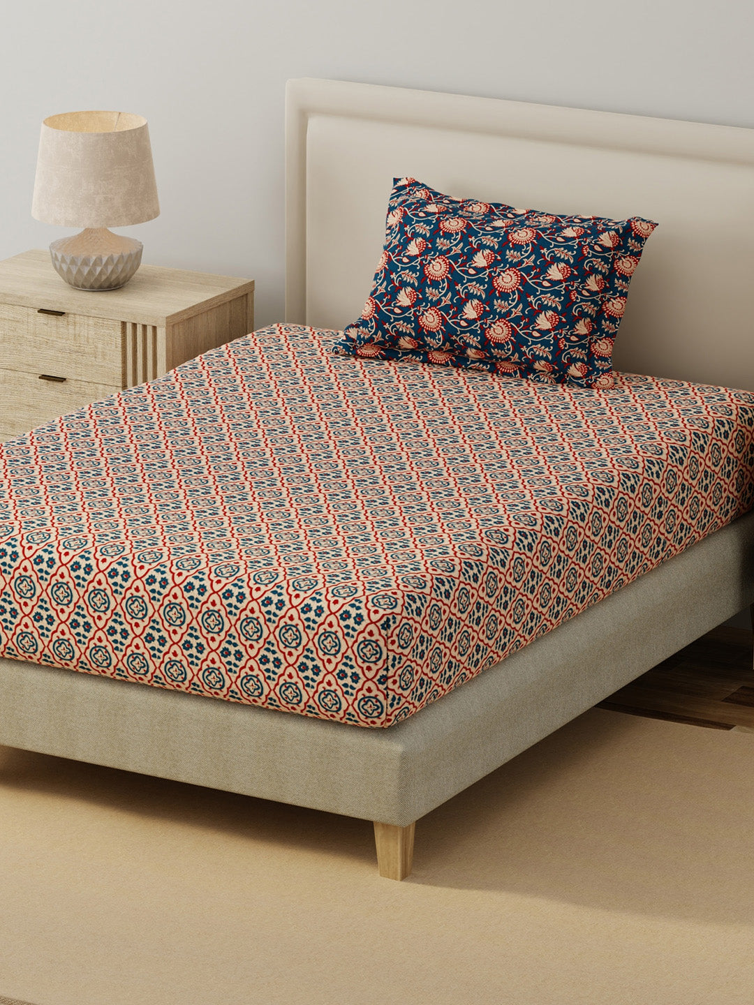 BasicX 100% Cotton 120 TC Blue Printed Single Bedsheet with 1 Pillow Cover