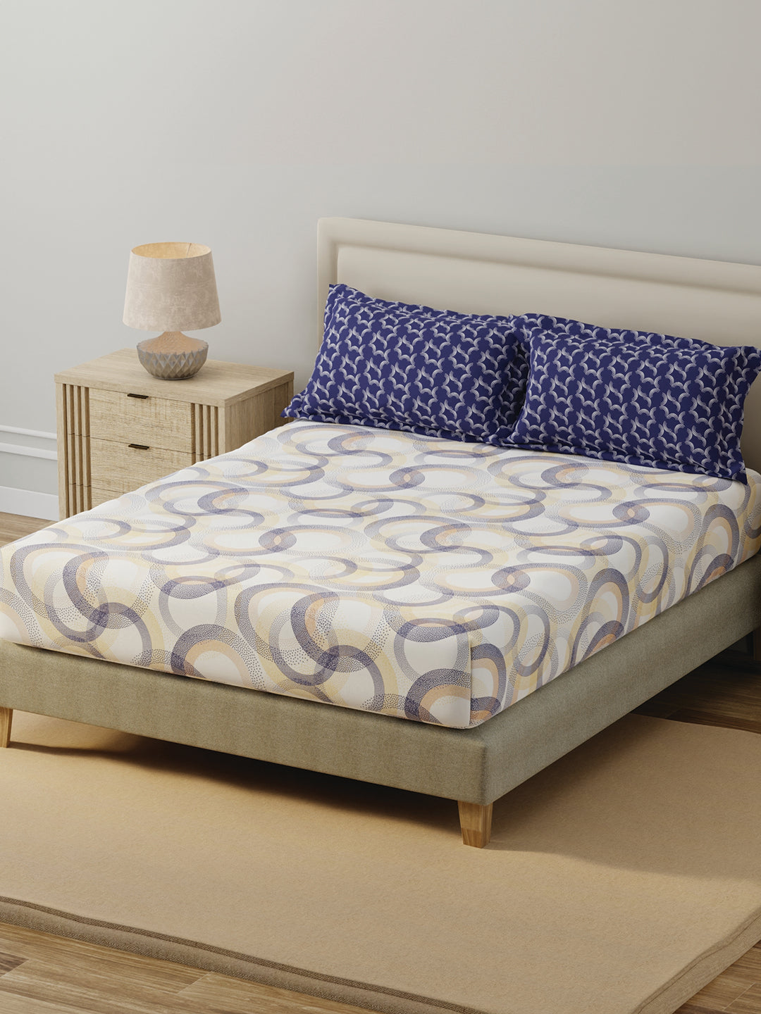 BasicX 100% Cotton 120 TC Blue & White Geometric Double Bedsheet with 2 Pillow Covers