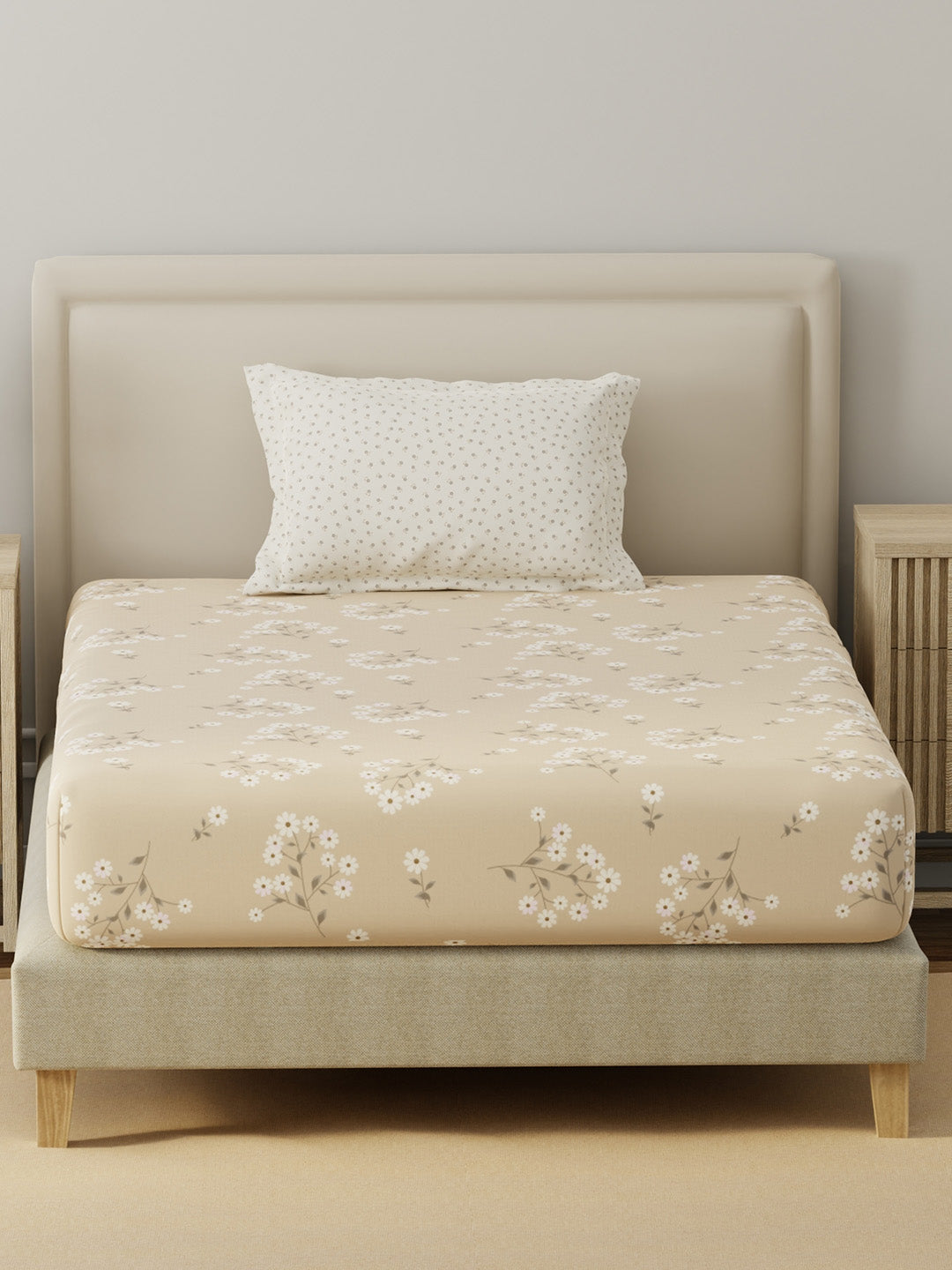 BasicX 100% Cotton 120 TC Cream Floral Single Bedsheet with 1 Pillow Cover