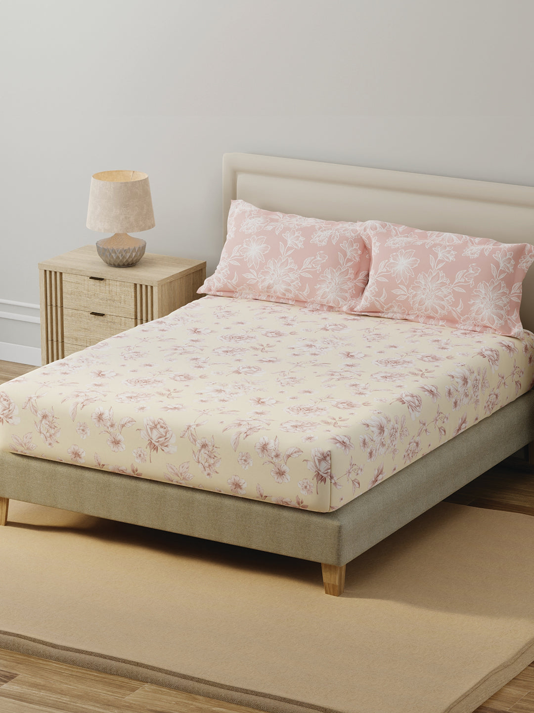BasicX 100% Cotton 120 TC Cream & Pink Floral Double Bedsheet with 2 Pillow Covers
