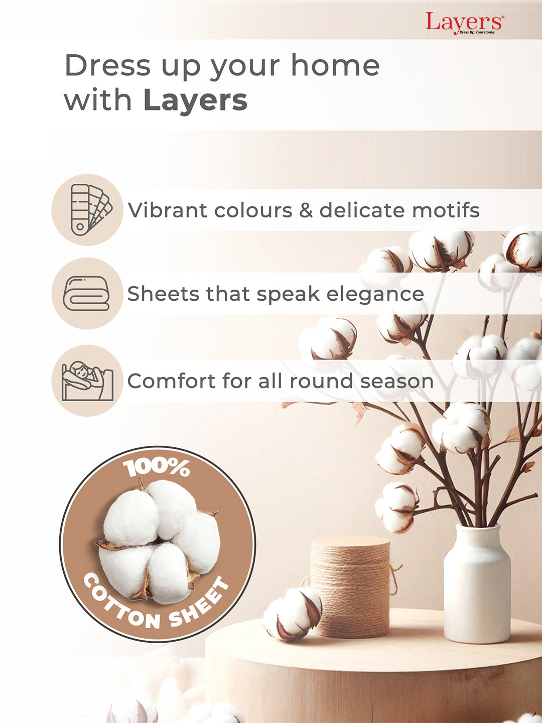 Experience the ultimate in comfort and style with Layers BasicX 100% Cotton Bedsheet set. Made from premium 120 TC cotton, this bedsheet offers a soft, breathable feel and lasting durability. Each set includes a bedsheet and 2 pillow covers, featuring prints inspired by nature and contemporary design.