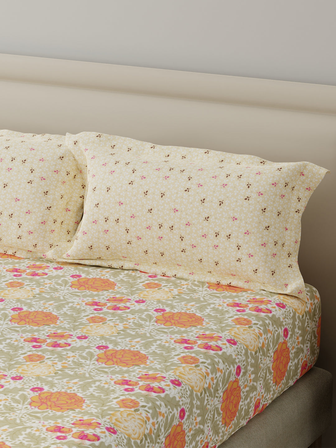BasicX 100% Cotton 120 TC Yellow & Grey Floral King Bedsheet with 2 Pillow Covers