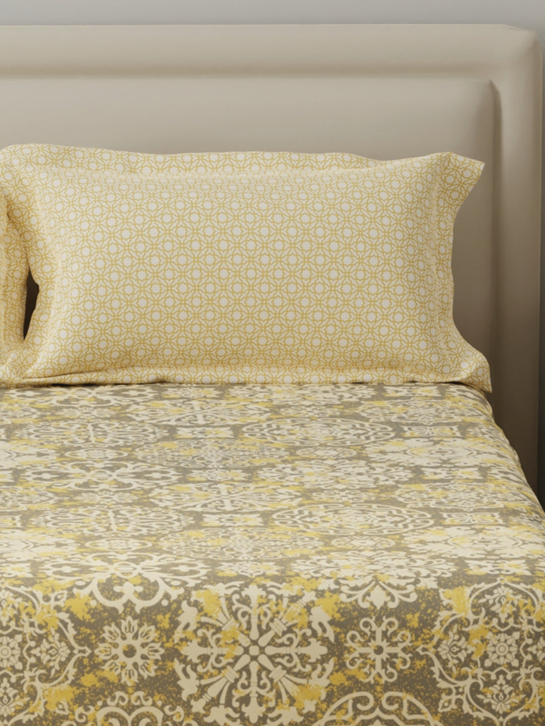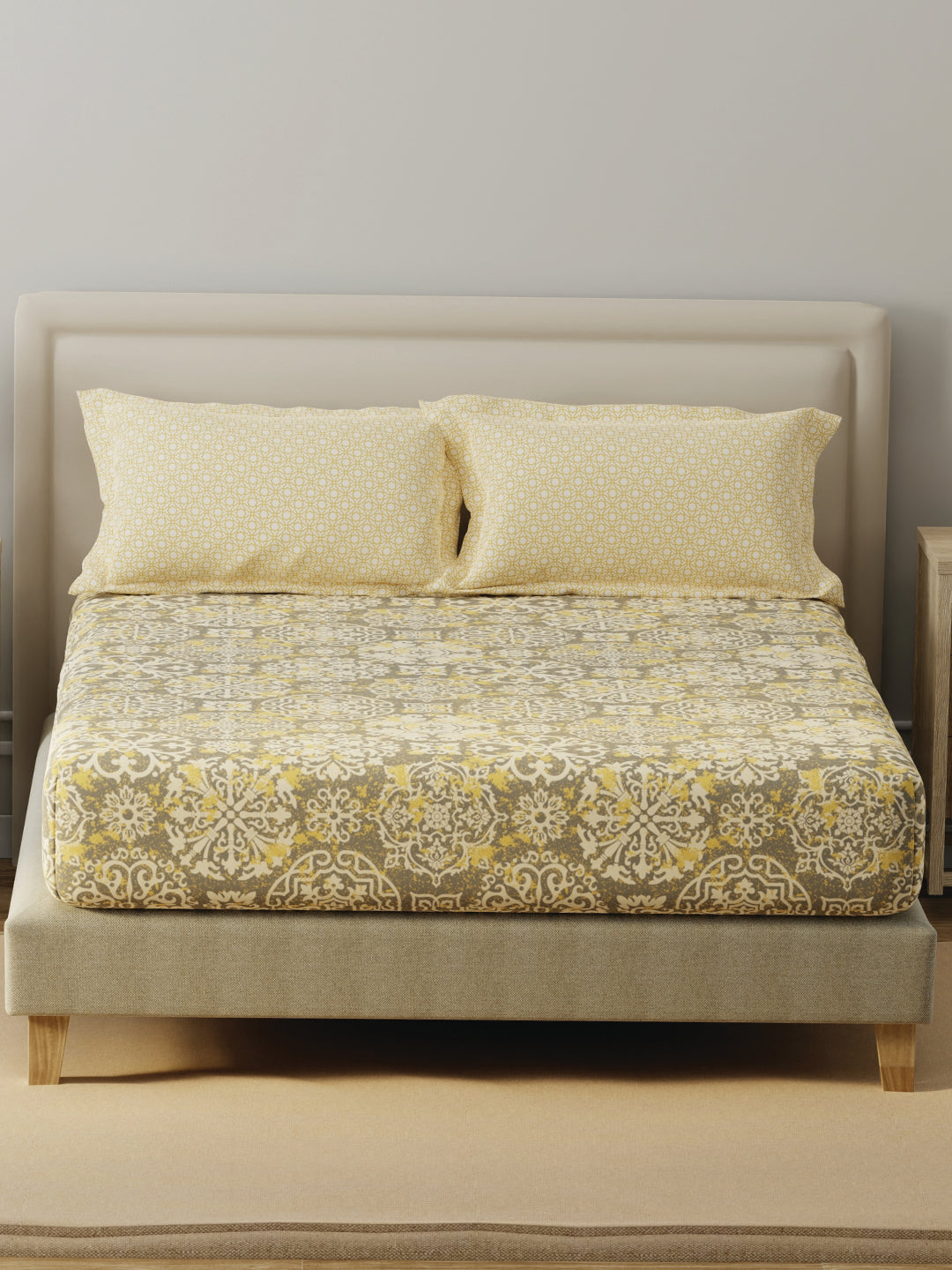 BasicX 100% Cotton 120 TC Yellow & Grey Printed Double Bedsheet with 2 Pillow Covers