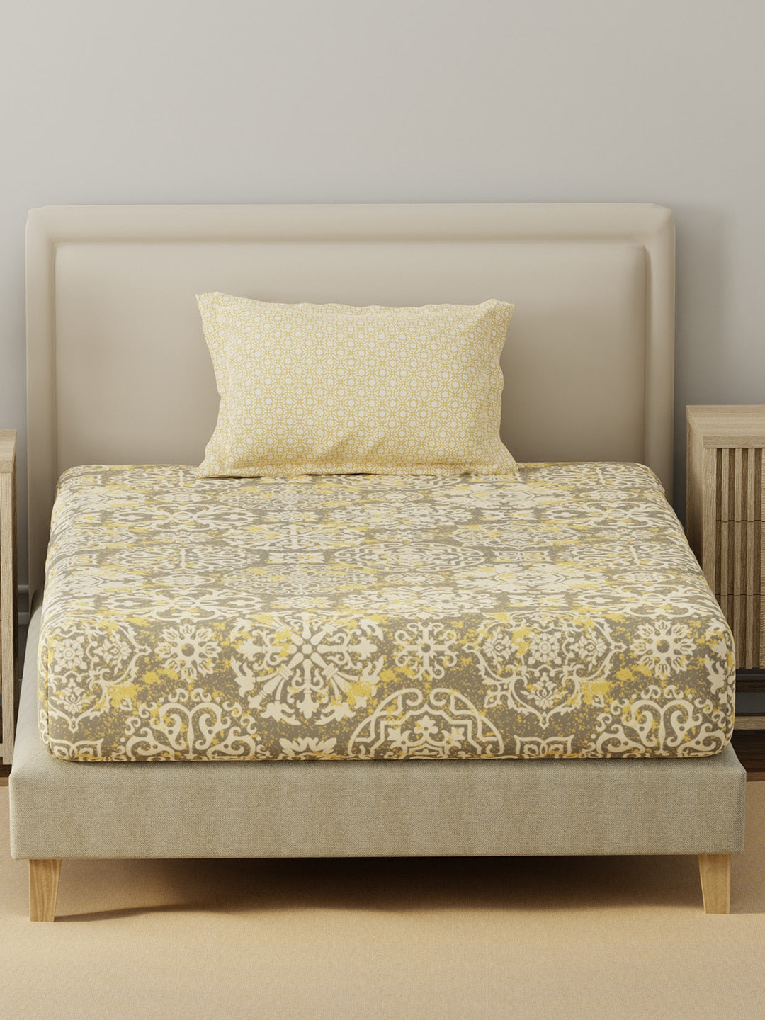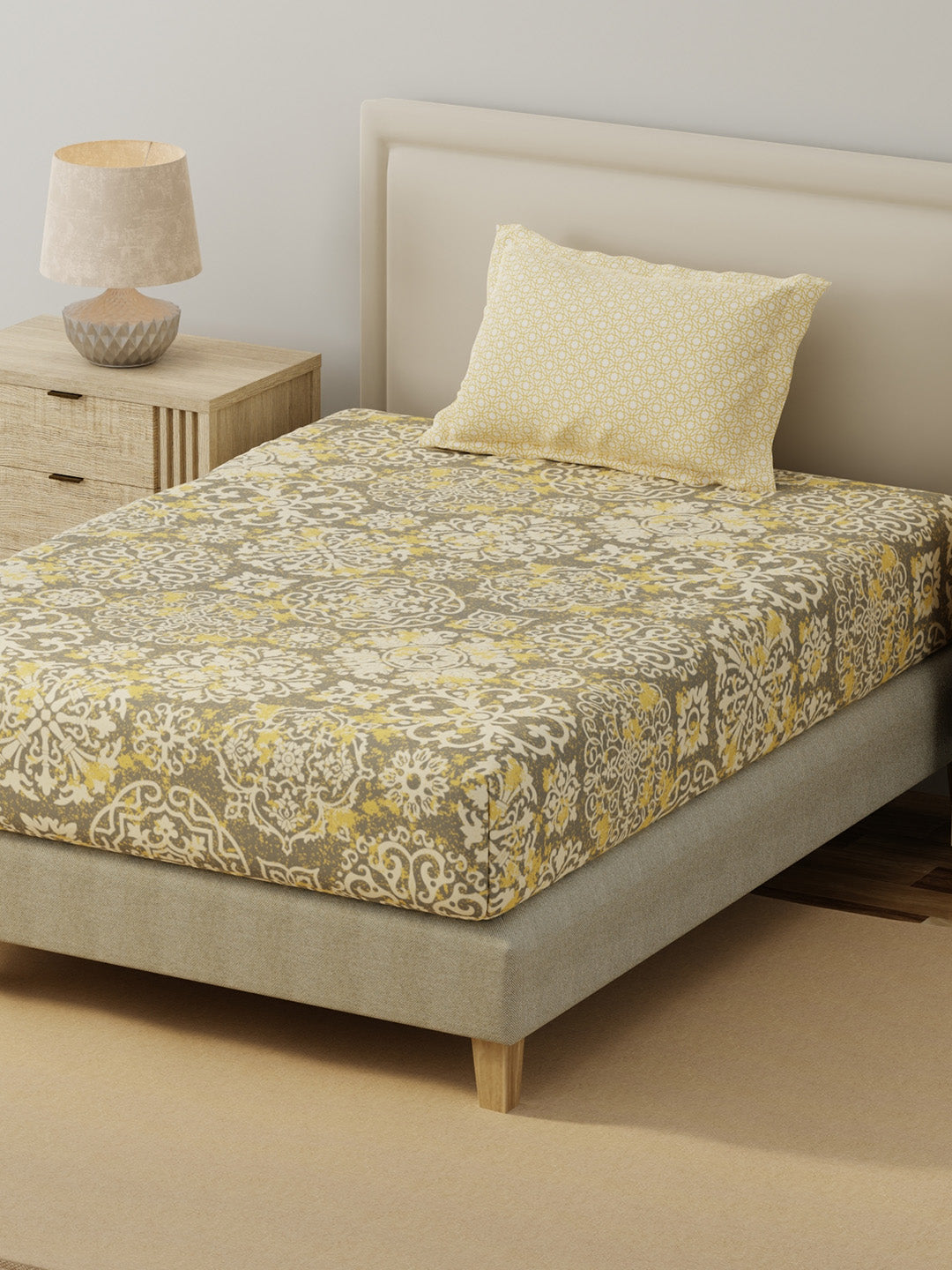 BasicX 100% Cotton 120 TC Yellow & Grey Printed Single Bedsheet with 1 Pillow Cover