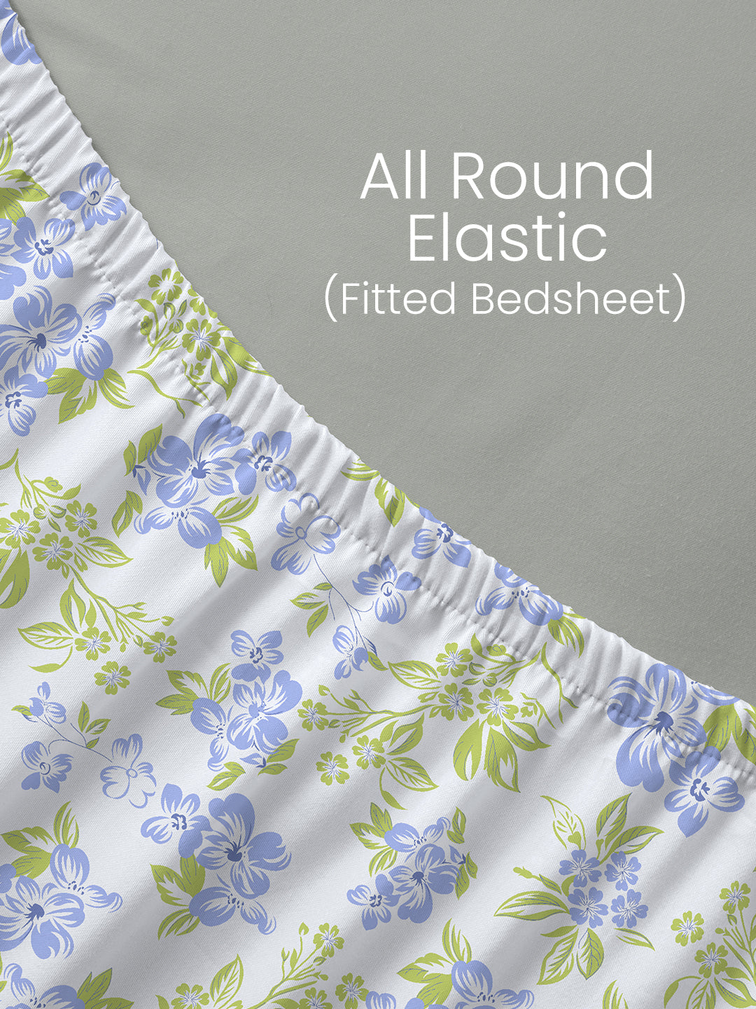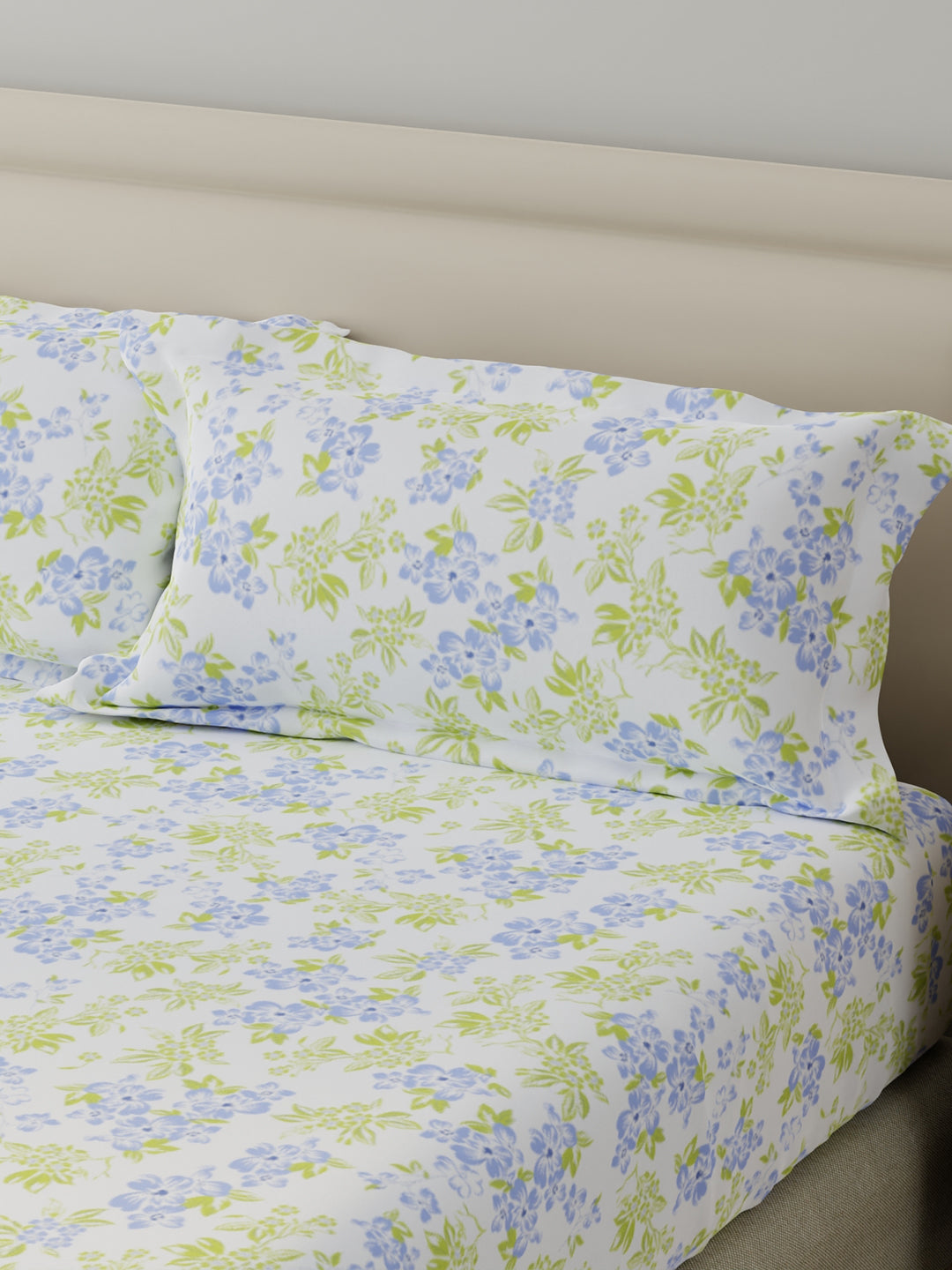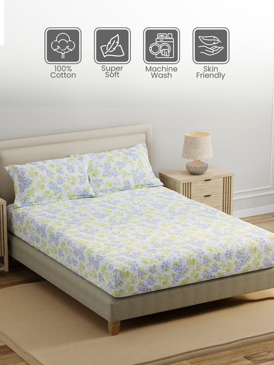 King Fitted Sheet Set, 100% Cotton 140 TC, Blue & Green Floral, Home Easy