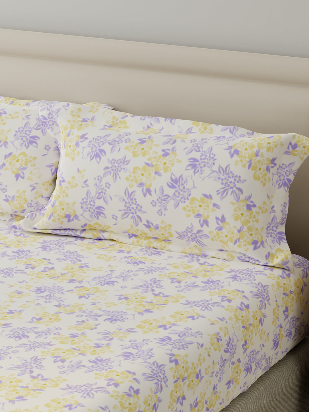King Fitted Sheet Set, 100% Cotton 140 TC, Yellow & Purple Floral, Home Easy
