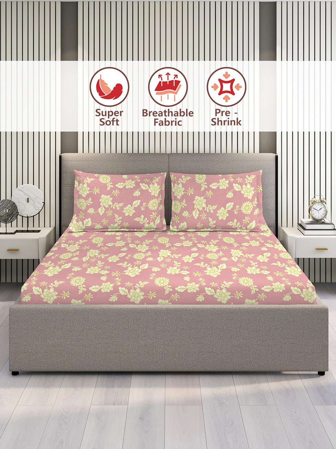 Home Easy 100% Cotton 144 TC Pink Floral King Size Bedsheet with 2 Pillow Covers